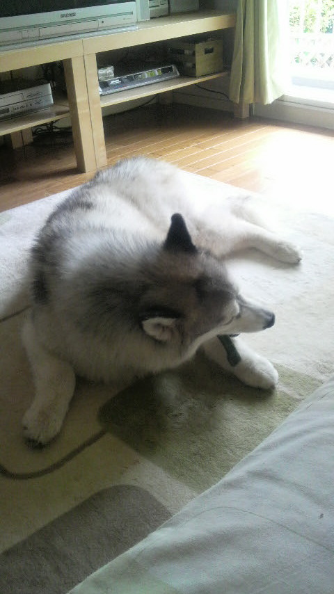 たたんだ洗濯物の上に寝転んで抗議しました。